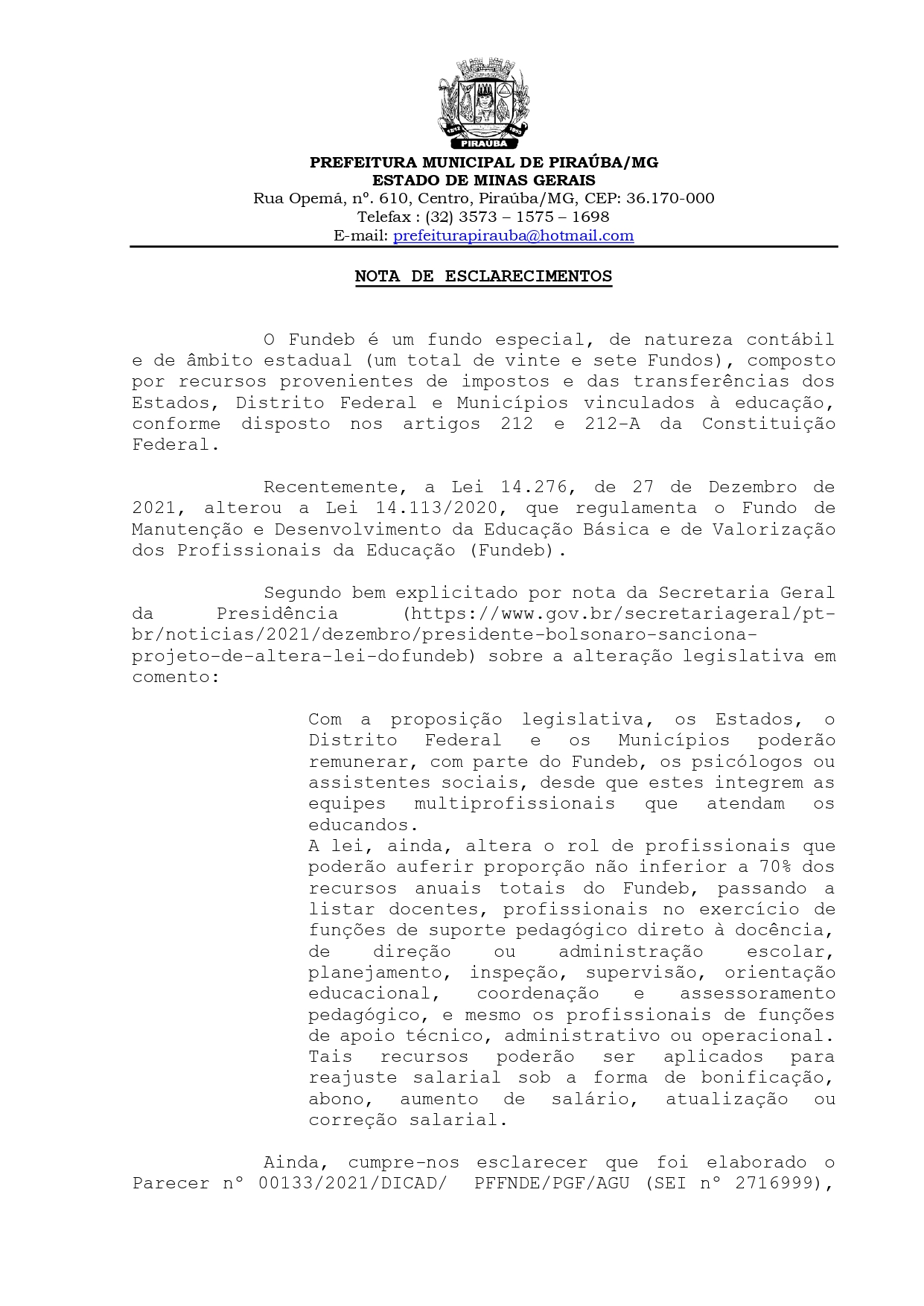 NOTA DE ESCLARECIMENTO FUNDEB