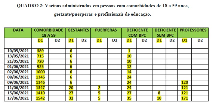QUADRO 2: Vacinas administradas em pessoas com comorbidades de 18 a 59 anos, gestante/puérperas e profissionais de educação.