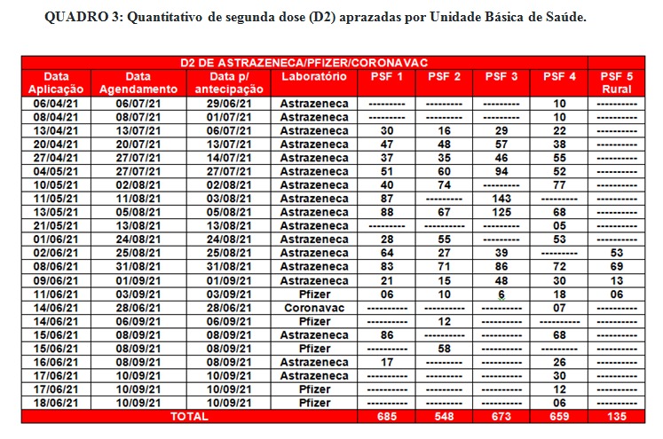 O município tem agendamento de 2.700 segunda dose (D2) até 10 de setembro/2021, esse quantitativo será enviado ao município mediante planilha de distribuição da Secretaria de Estado de Saúde de Minas Gerais (SES-MG). Aguardamos nova remessa dos imunobiológicos e orientações para prosseguimento da Campanha.