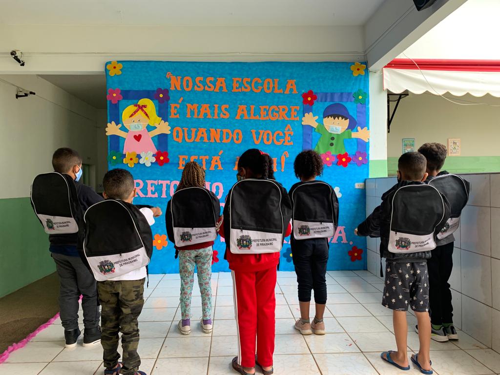 Assim, cada escola preparou junto com os profissionais da educação, com muito carinho e responsabilidade, as salas de aula, a merenda, todos os ambientes da escola para receber o retorno dos alunos. Foram distribuídas também mochilas para as crianças uma vez que o novo protocolo sanitário autoriza o retorno do material escolar usado em salas de aula para casa.