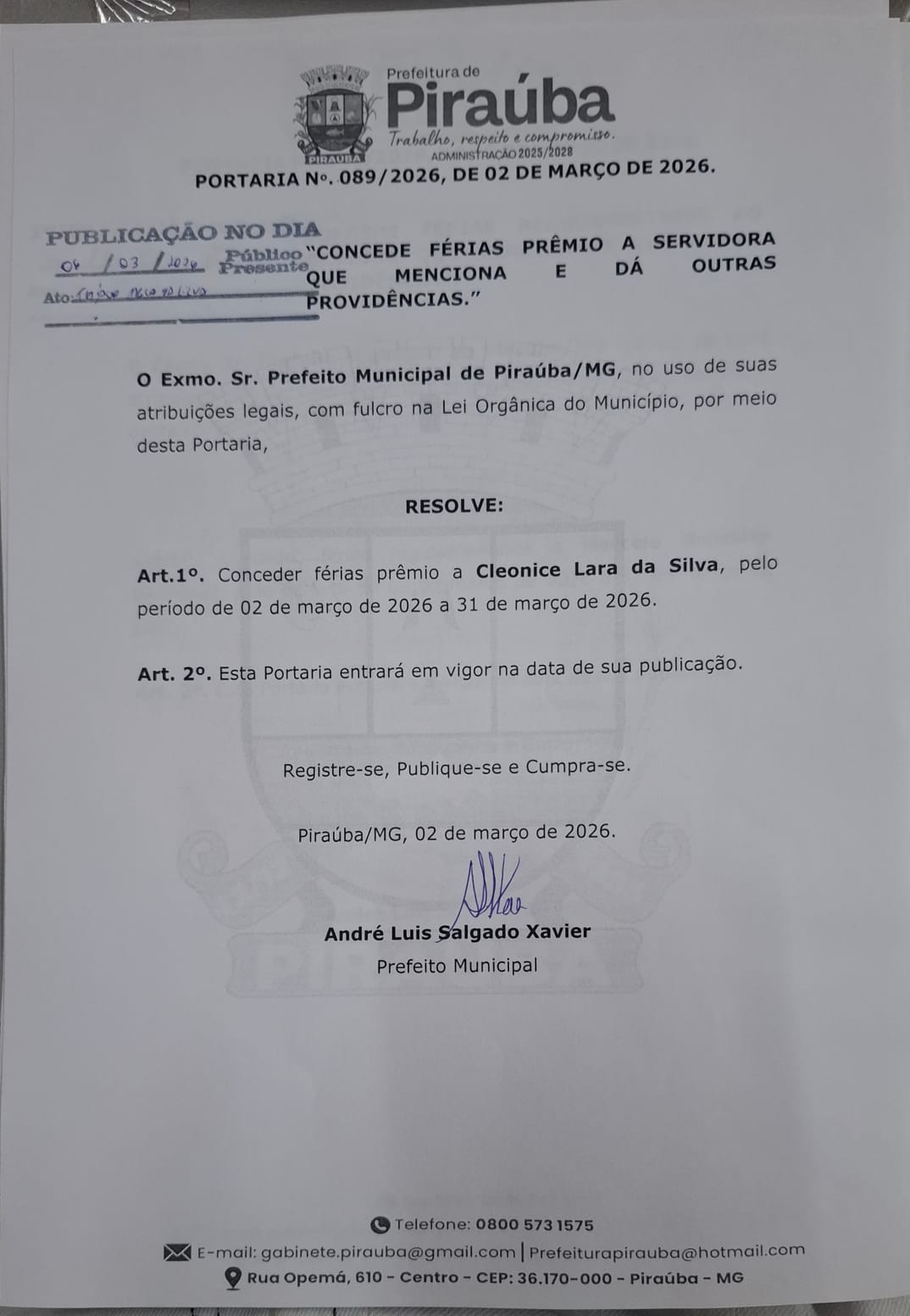 PORTARIA 089/2026 - FÉRIAS PRÊMIO - CLEONICE LARA DA SILVA