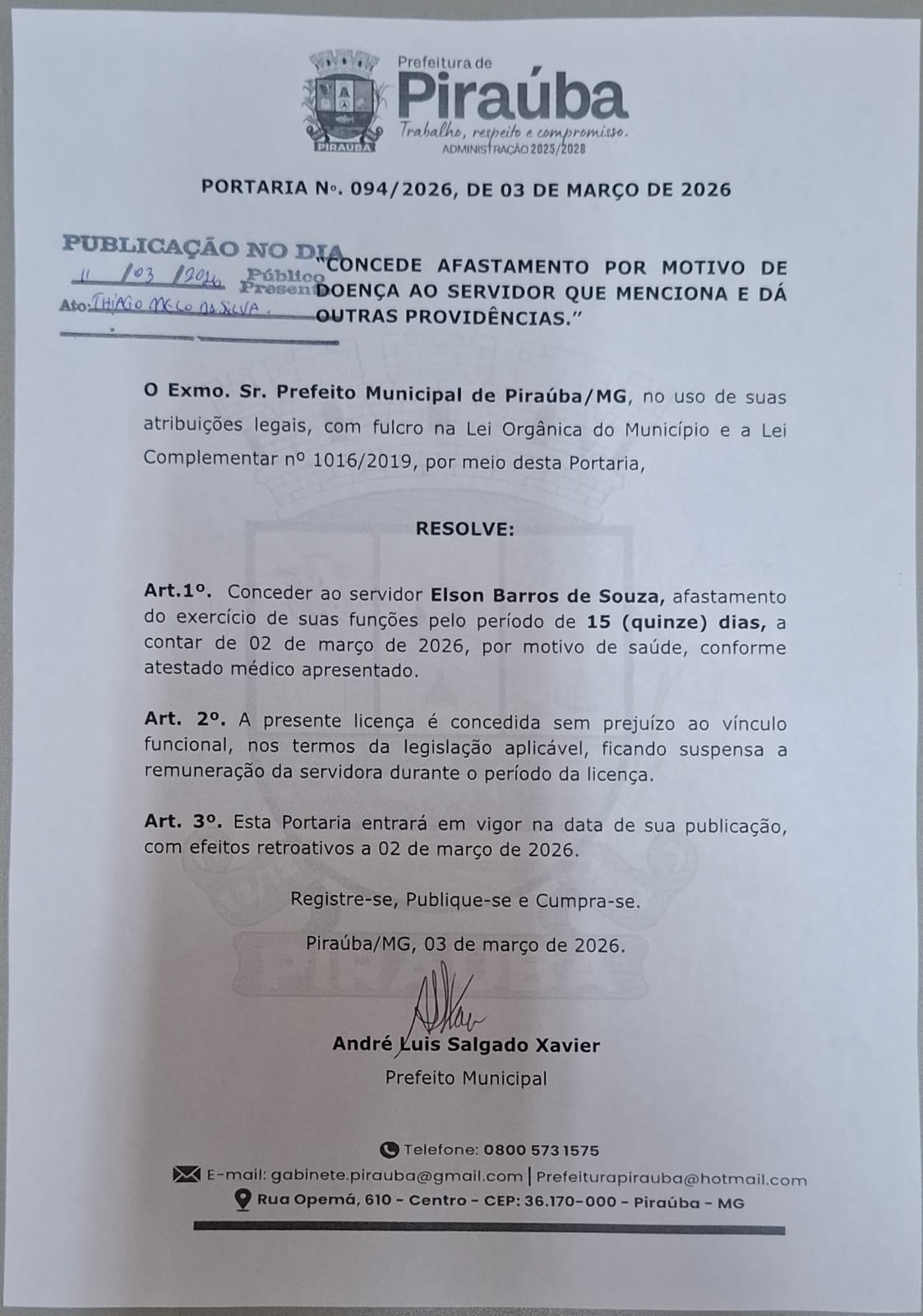 PORTARIA 094/2026 - AFASTAMENTO POR SAÚDE - ELSON BARROS DE SOUZA