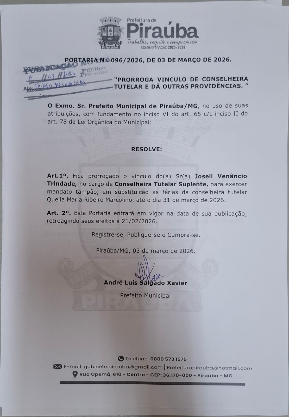 PORTARIA 096/2026 - PRORROGA VINCULO DE CONSELHEIRA TUTELAR