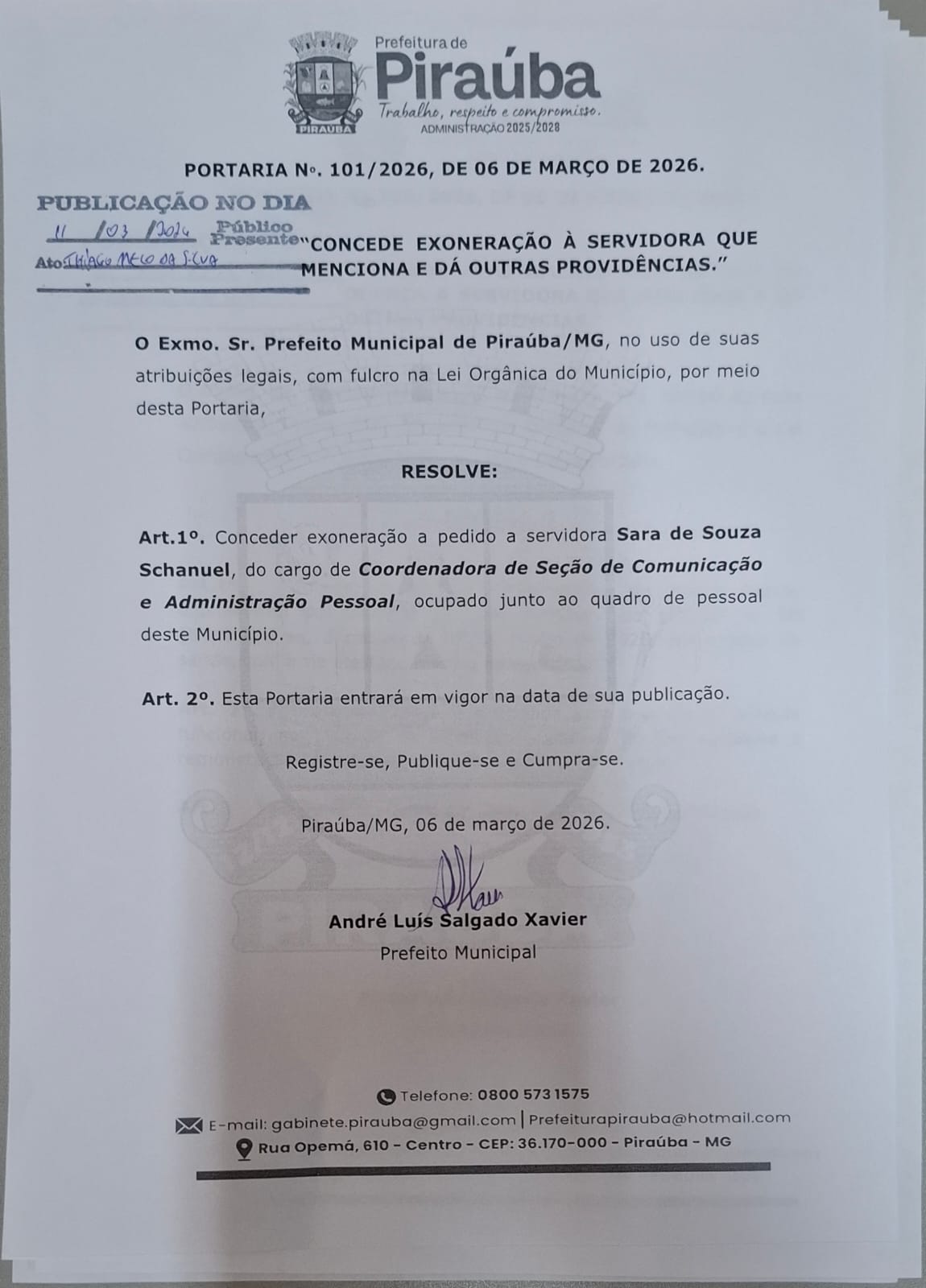 PORTARIA 101/2026 - EXONERAÇÃO - SARA DE SOUZA SCHANUEL