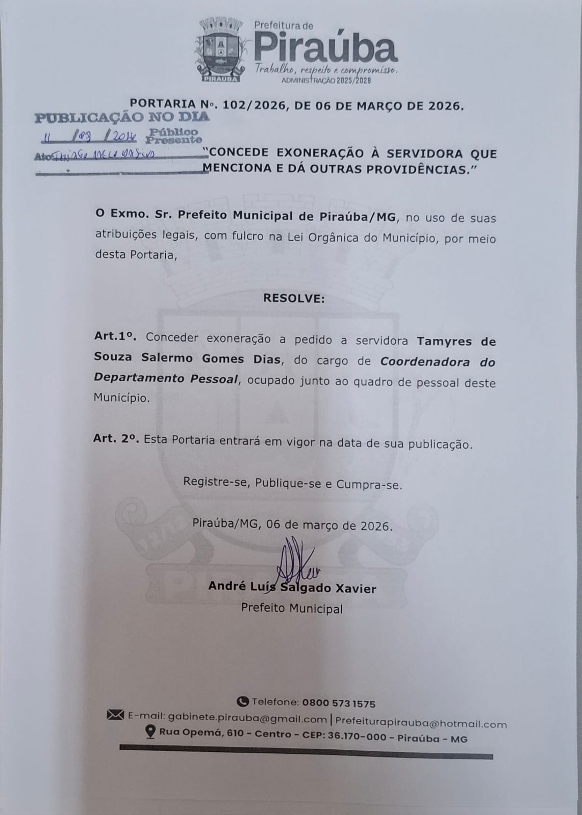 PORTARIA 102/2026 - EXONERAÇÃO - TAMYRES DE SOUZA SALERMO GOMES DIAS