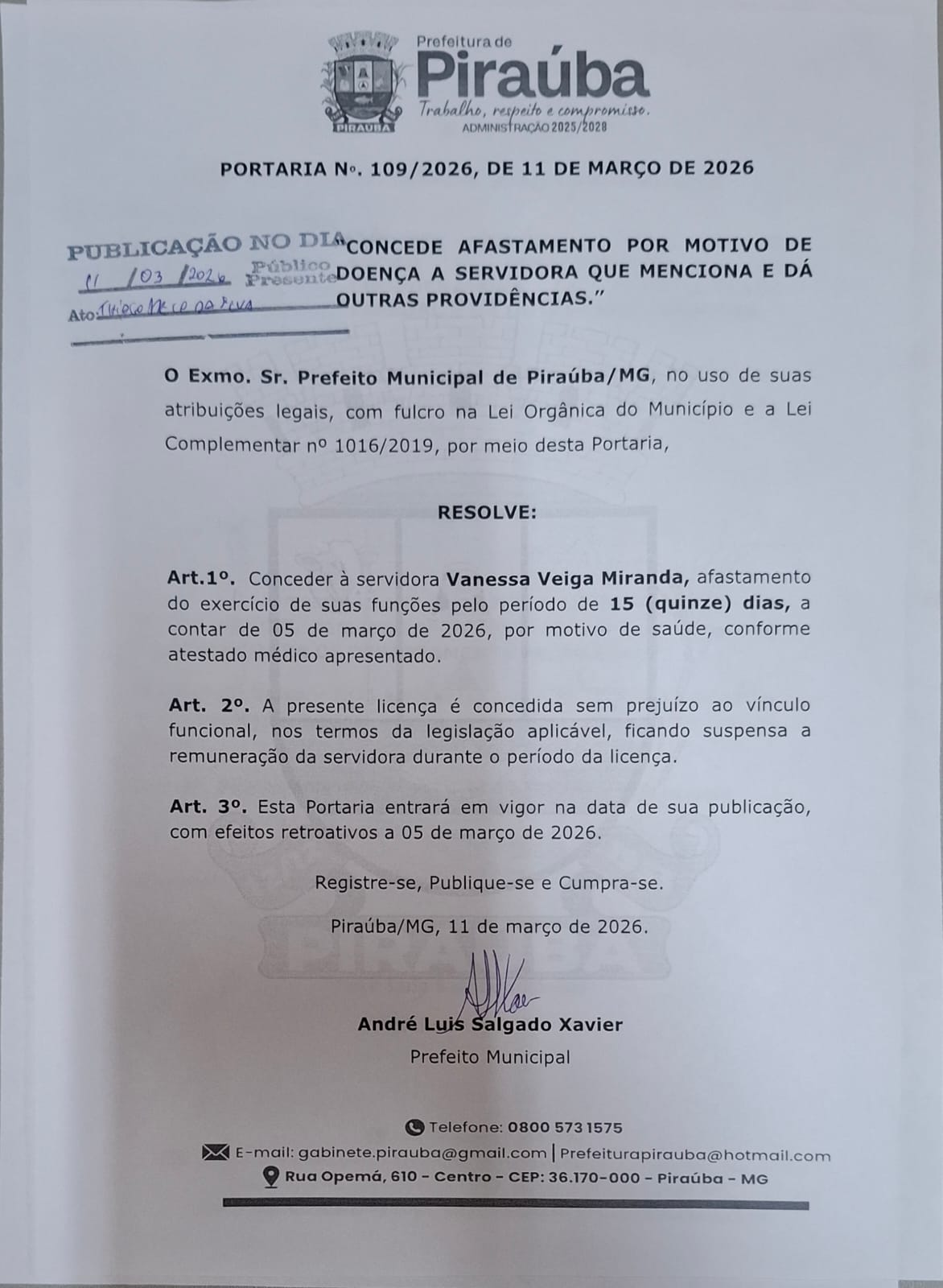 PORTARIA 109/2026 - AFASTAMENTO POR SAÚDE - VANESSA VEIGA MIRANDA