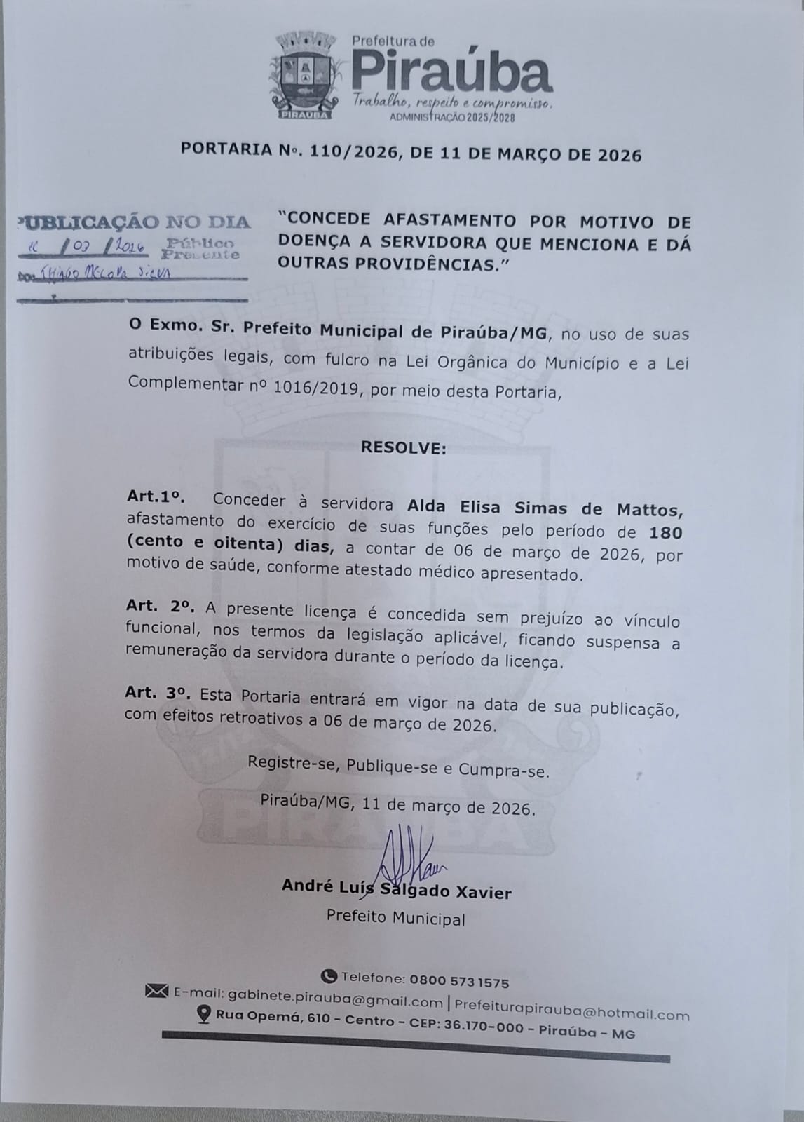 PORTARIA 110/2026 - AFASTAMENTO POR SAÚDE - ALDA ELISA SIMAS DE MATTOS