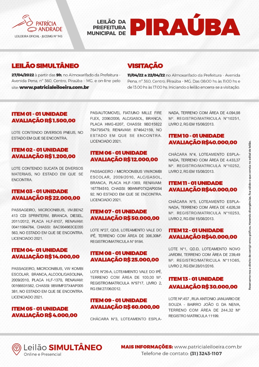 LEILÃO DA PREFEITURA MUNICIPAL DE PIRAUBA