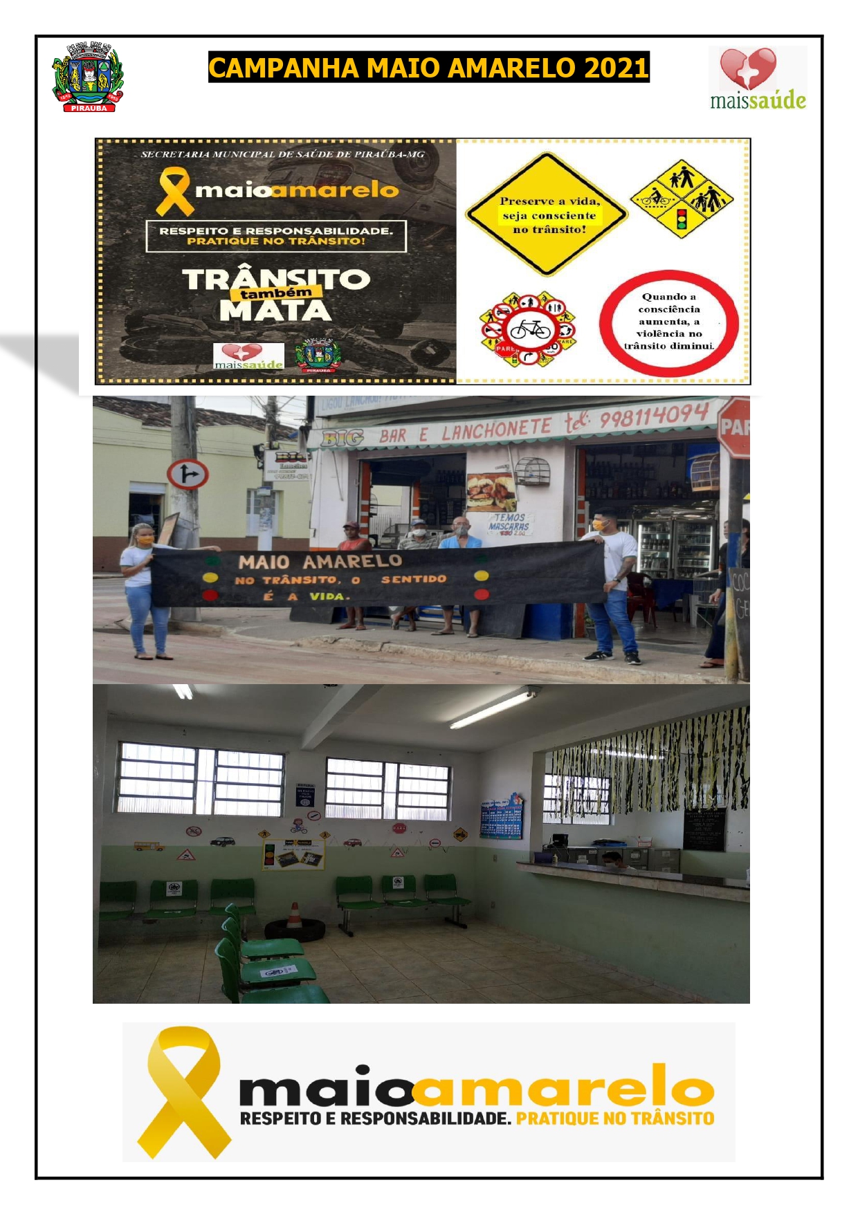 No intuito de promover a cultura de segurança no trânsito e minimizar os danos decorrentes dos acidentes em vias públicas, a Secretaria Municipal de Saúde de Piraúba, através das Unidades Básicas de Saúde, Equipe Multidisciplinar, Polícia Militar, entre outros, realizou durante o mês de maio, diversas ações de conscientização a população piraubana referentes aos cuidados no trânsito e qualidade de vida.