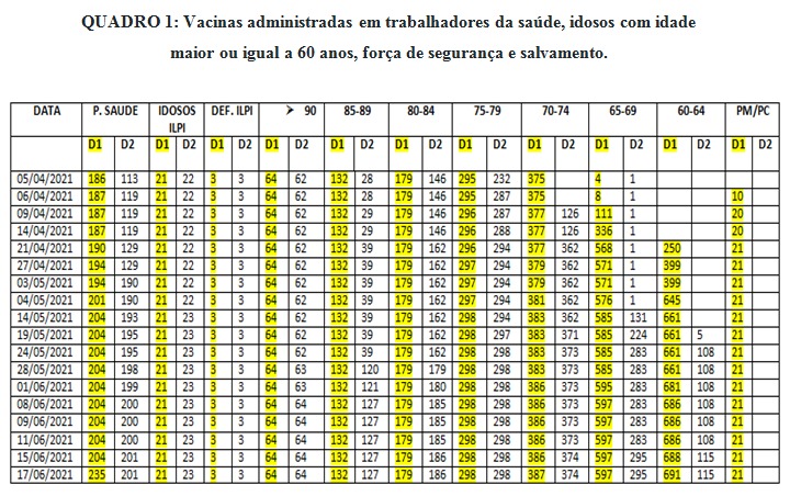 QUADRO 1: Vacinas administradas em trabalhadores da saúde, idosos com idade maior ou igual a 60 anos, força de segurança e salvamento.