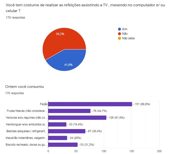 Mediante suspensão das aulas presenciais, o formulário do Google Forms foi enviado via aplicativo Whatsapp no grupo utilizado para interação dos professores com os alunos. Ao todo foram 170 respostas (51,2% do sexo masculino e 48,8 % do sexo feminino). O estudo mostrou que 58,2% desta população afirma assistir TV ou utilizar algum dispositivo eletrônico durante as refeições. O recordatório alimentar de 24 horas mostrou que 88,8% consumiram feijão, 44,7% frutas frescas, 61,8% legumes e verduras, 19,4% hambúrguer ou embutidos, 39,4% bebidas adoçadas, 20% macarrão instantâneo ou salgados de pacote e 31,2% doces e guloseimas.